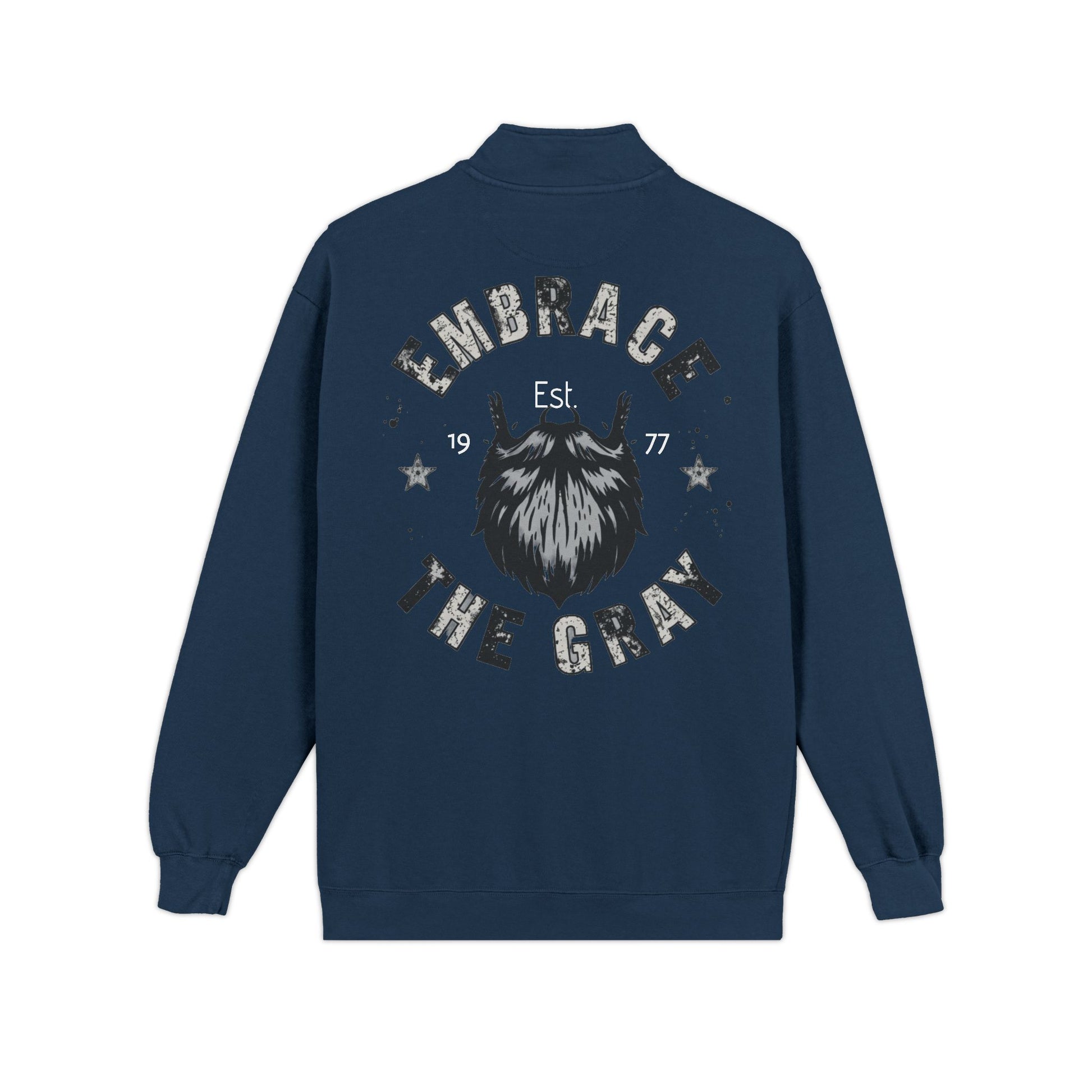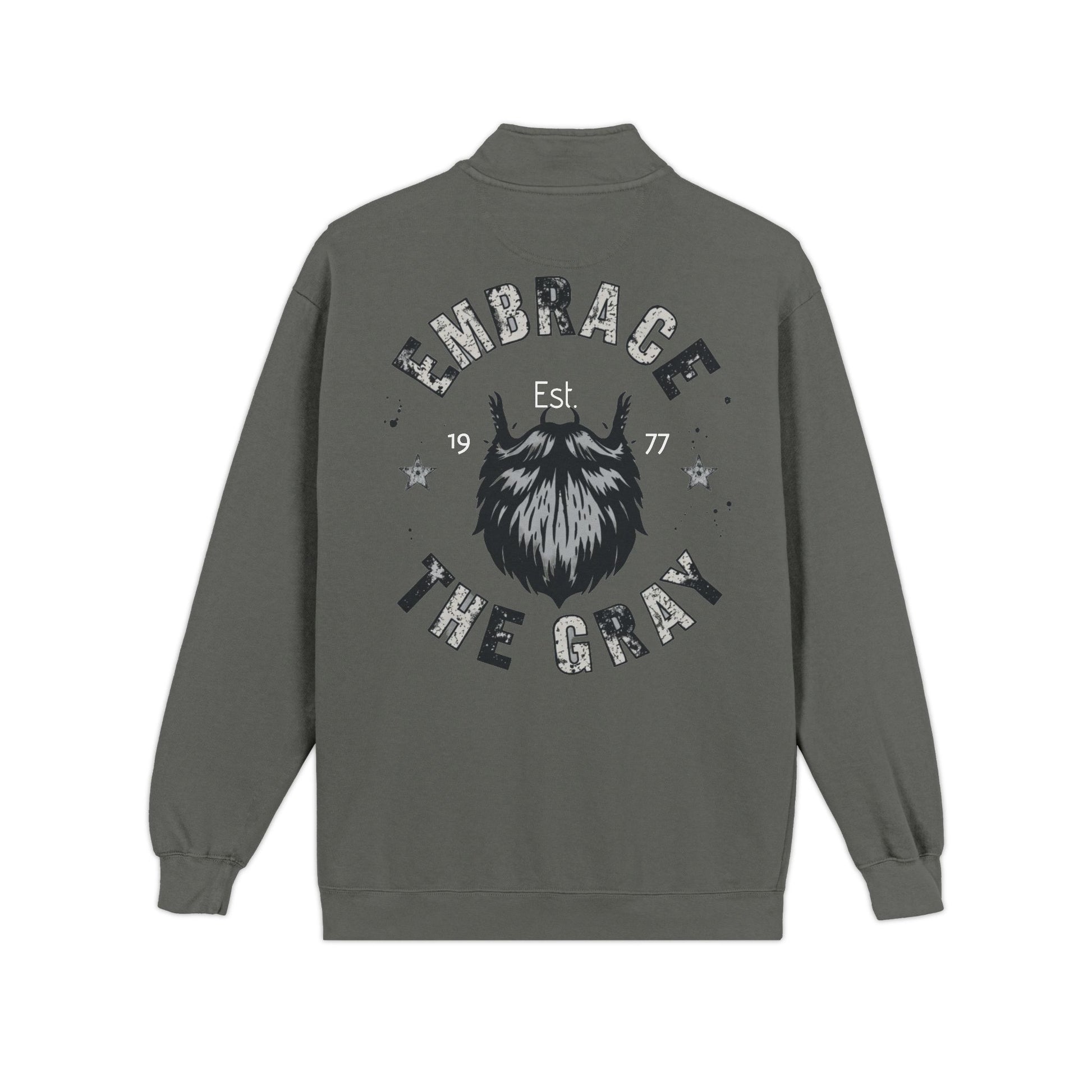 This quarter-zip brings slow mornings and long road trips into one soft, lived-in layer. The heavyweight, ring-spun cotton holds a relaxed silhouette while the self-fabric collar and zipper add a tidy, functional touch. On the front, a small signature script sits over the heart; on the back, a weathered emblem and the phrase “Embrace the Gray” curl around a rugged beard motif — a design that feels equal parts campfire grit and quiet confidence. Wear it when the air turns crisp, when you’re heading out for a cabin weekend, or when you want the comfort of a favorite hoodie with a smarter neckline. It layers easily under a jacket or stands alone as a statement piece for slow, intentional days.